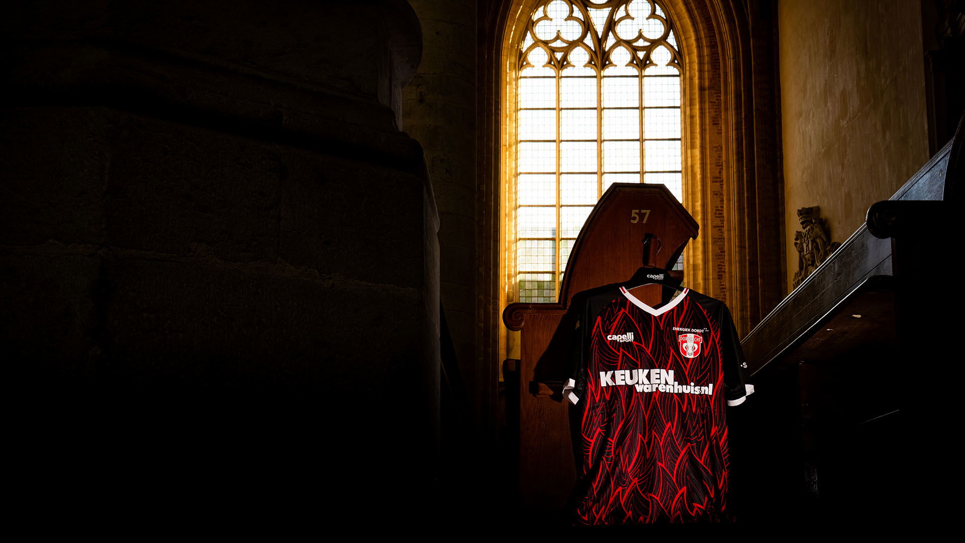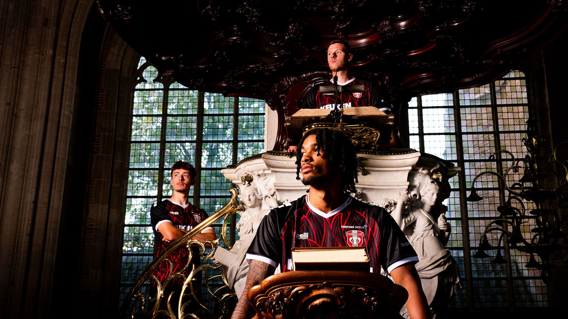 Met dit opvallende design brengen we niet alleen de rijke historie van de stad tot leven, maar betreden we ook het veld met vuur en strijdlust. Die symboliek stond centraal tijdens de campagnebeelden in de Grote Kerk, waar Yannick Eduardo, Lawson Sunderland en Nick Venema poseerden bij de Jeruzalemkapel. Daar is de stadsbrand afgebeeld in een raamwerk, wat de link tussen verleden en heden extra lading geeft.
