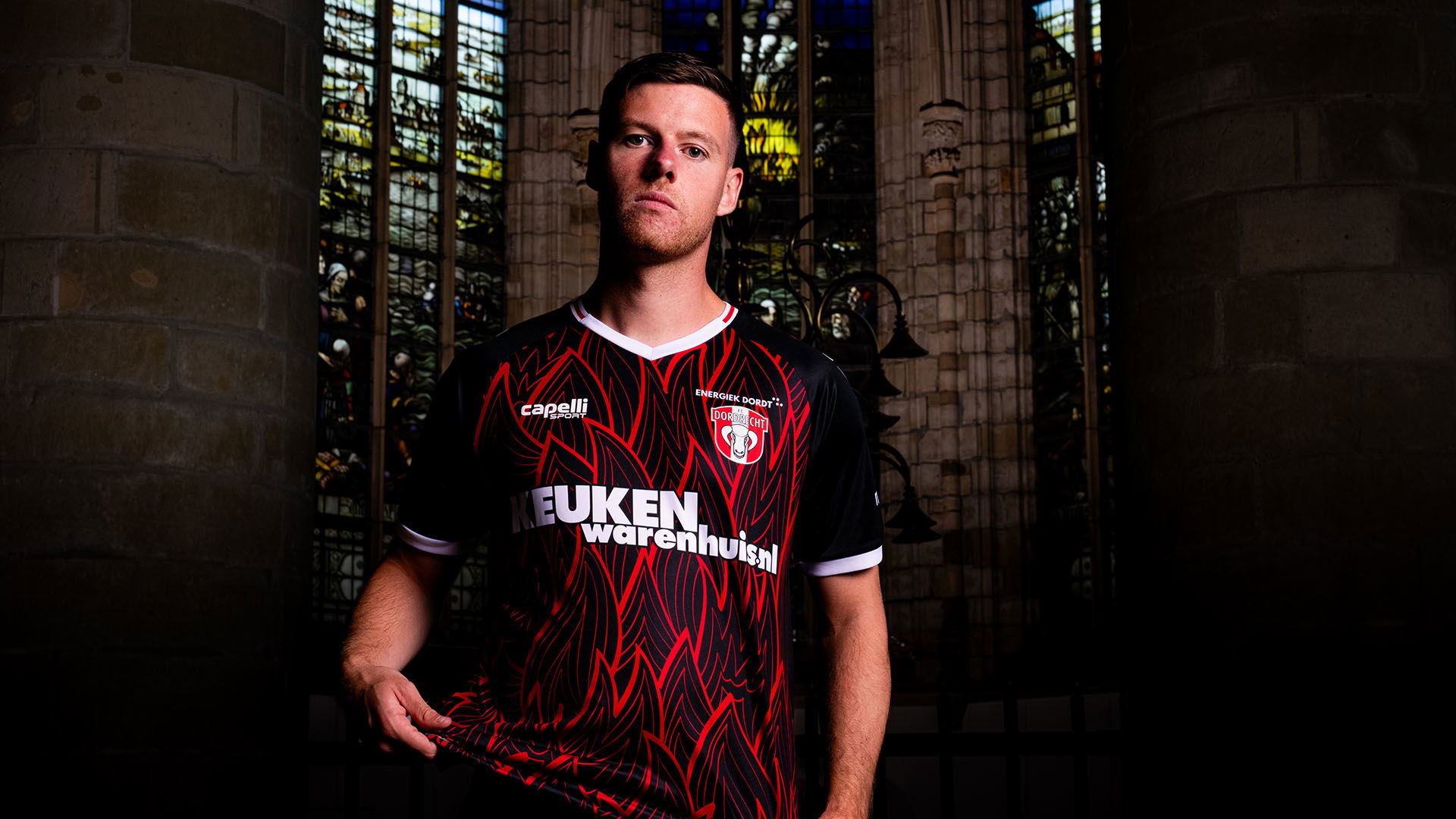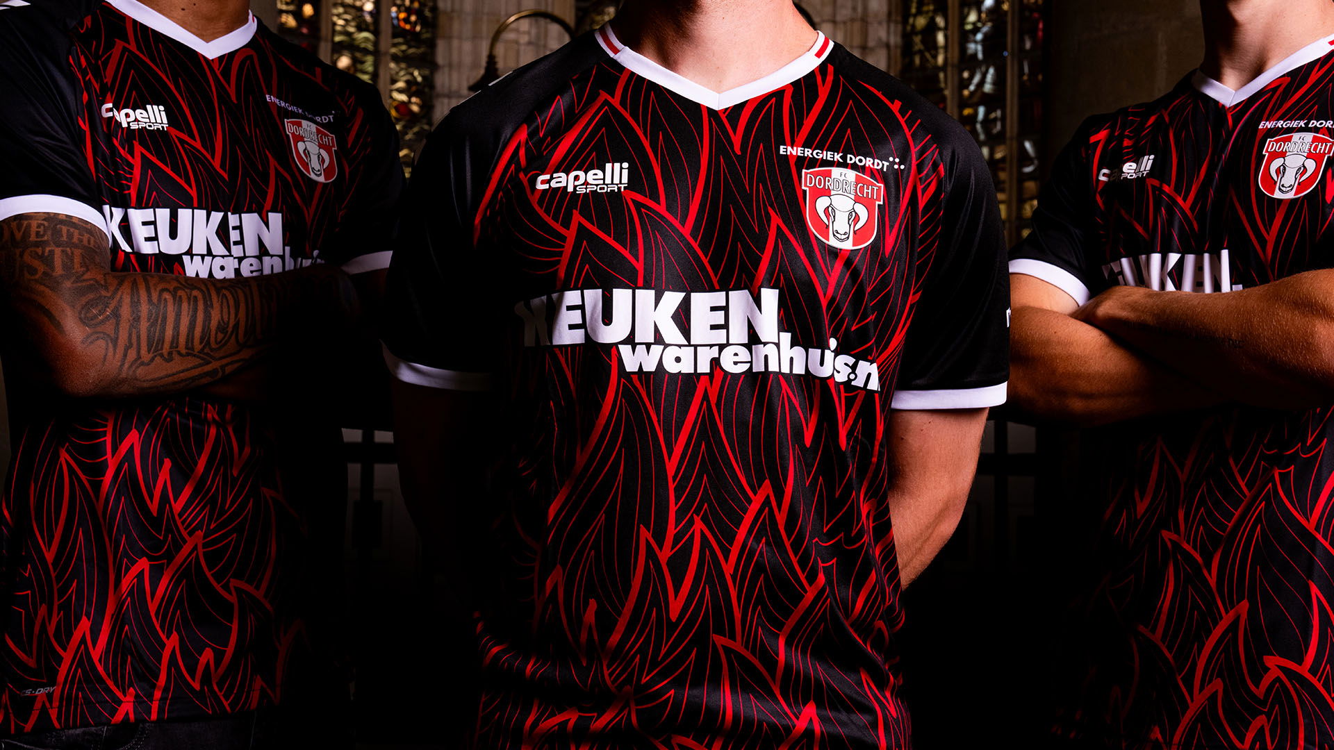 FC Dordrecht presenteert in samenwerking met kledingsponsor Capelli Sport het nieuwe derde tenue van het seizoen 2025/2026. Het zwart met rode vlammenpatroon is een krachtig eerbetoon aan de historische stadsbrand van 1457, die destijds een groot deel van Dordrecht in de as legde.