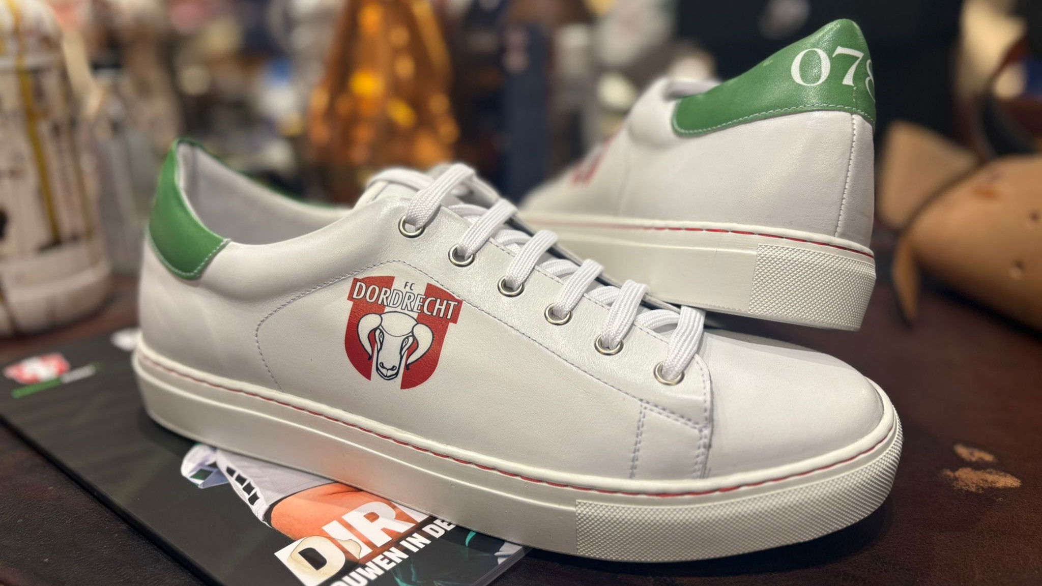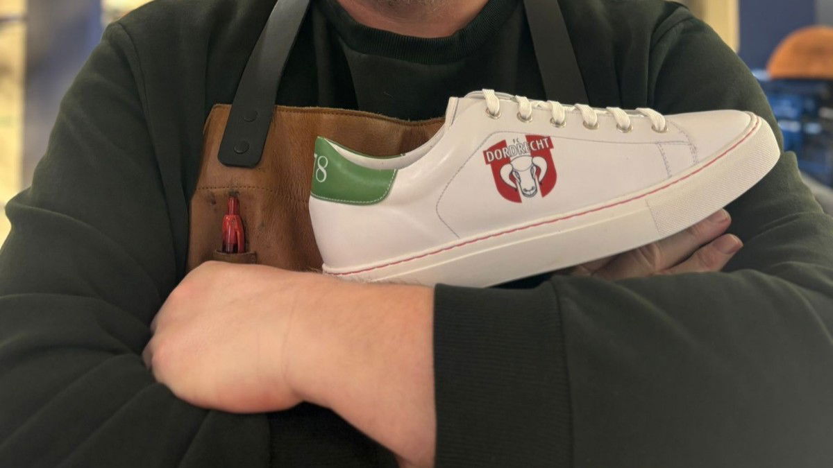 “Ik noem het wel een sneaker, maar het is niet zomaar een sneaker: het is eigenlijk een belachelijk goed gemaakte schoen. De oplage is heel klein, maar we kunnen wel alles voor je laten maken. Wil je er bijvoorbeeld nog extra tekst op, zoals ‘Een Dordtenaar zal altijd blijven zingen’? Dat kan.