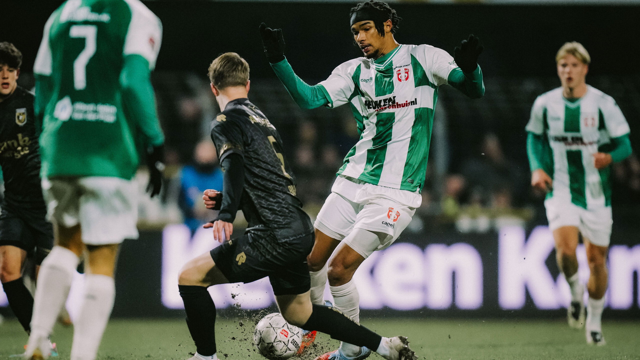 Opstelling FC Dordrecht: Coremans (K); Van Aken (63. Codutti), Drakpe, Woudenberg (C), Hilton; Vugts (78. Vetkal), Van der Sluijs (63. Van Asten), Sunderland (86. Carrillo); Pynadath (78. Afaker), Eduardo, Venema.
