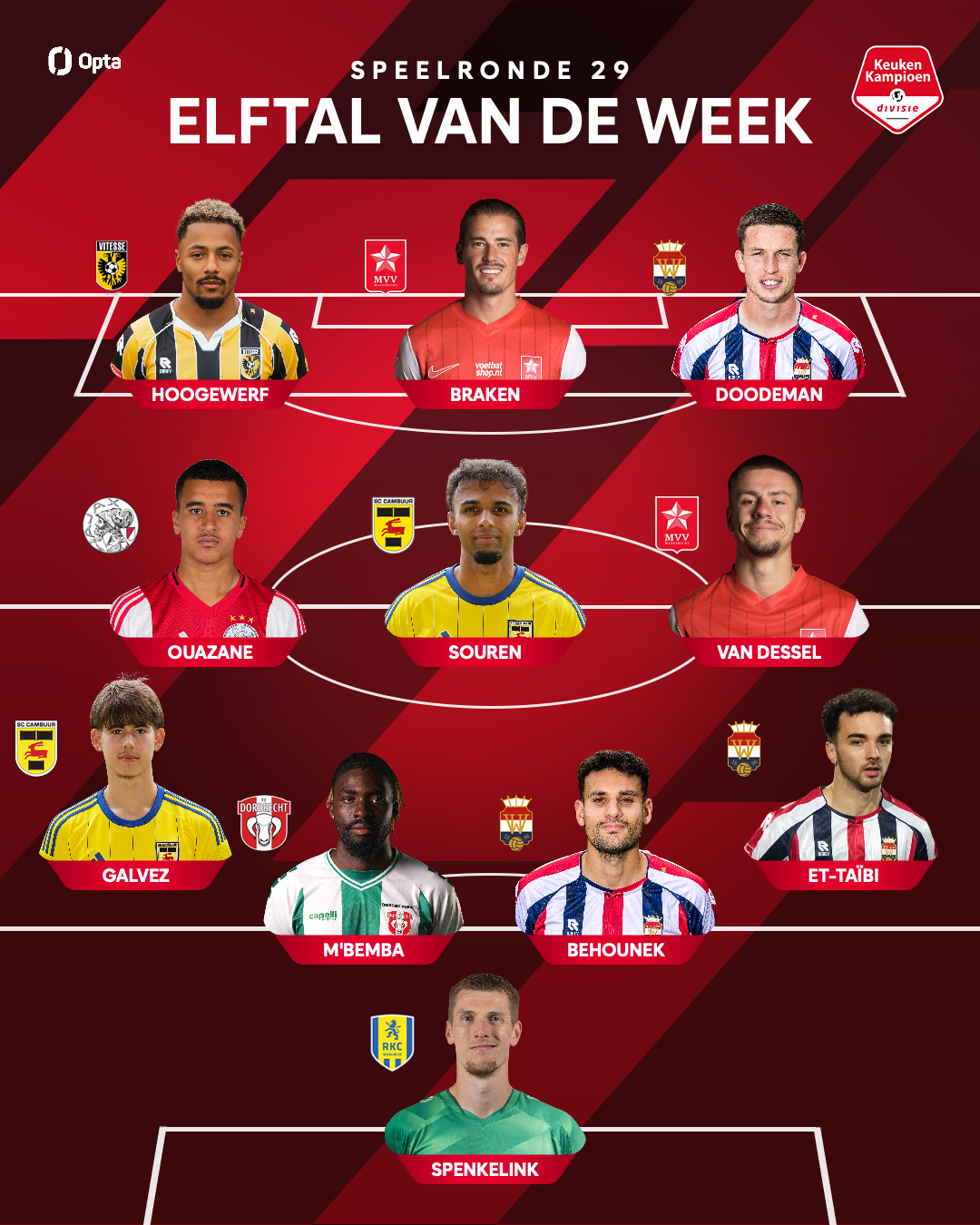 Yannis M’Bemba is door de Keuken Kampioen Divisie opgenomen in het Elftal van de Week. De 24-jarige verdediger maakte een sterke en stabiele indruk tijdens het 1-1 gelijkspel op bezoek bij Jong PSV.